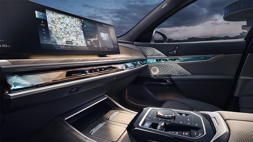 BMW i7 실내는 미래를 달리는 디자인을 확인해 볼 수 있습니다. 12.3인치 디지털 클러스터와 14.9인치 대형 디스플레이를 일자로 연결한 커브드 디스플레이는 첨단 이미지를 잘 보여주고 있습니다. 물리 버튼을 모두 없애면서 최대한 심플한 실내 구성을 보여주고 있습니다.