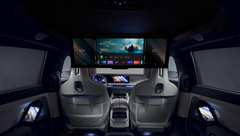 그리고 루프 상단에 31인치 8K 디스플레이를 탑재했습니다. 아마 모두가 꿈꿔왔던 기능이 아닐까 하는데요. 뒷자리에서 극장처럼 이용할 수 있게 하는 기능입니다. 다양한 OTT 서비스를 지원한다고 하니 기대가 되는 기능입니다. 그리고 32개 스피커를 탑재해 웅장한 사운드를 들을 수 있습니다. Bowers & Wikins 서라운드 사운드 시스템으로 적용되어 있습니다.