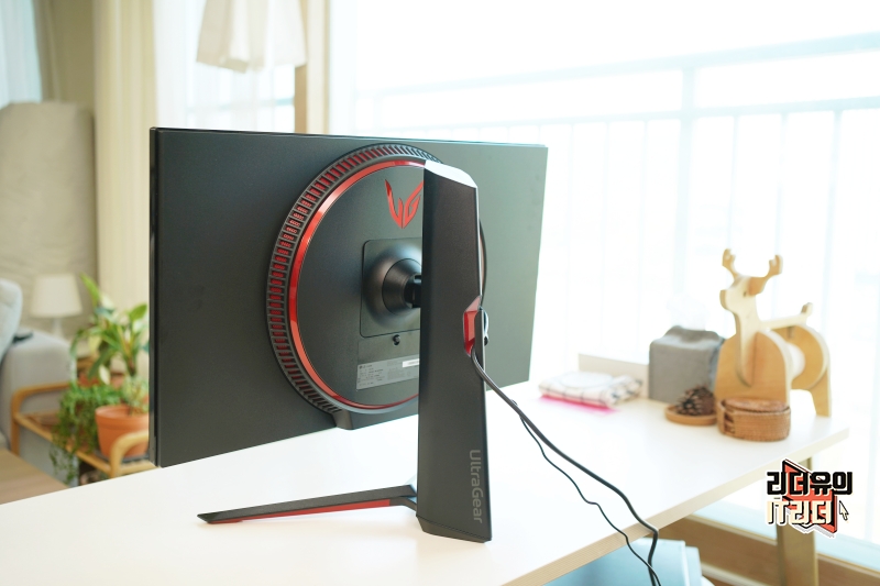 27인치 LG 울트라기어 게이밍모니터 27GP830 후면 모습은 게이밍 모니터의 디자인을 강조하는 화려한 포인트가 들어가 있습니다. 원형의 레드 컬러 포인트로 화사한 디자인을 느낄 수 있고 상단에는 울트라기어 로고를 새겨 브랜드 아이덴티티를 확실하게 느낄 수 있게 해주고 있습니다.