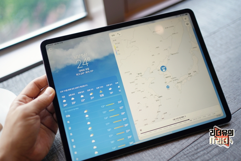 iPadOS 16에서는 아이패드의 대화면을 활용한 날씨 앱이 추가되었습니다. 대화면으로 한눈에 보기 좋게 정보를 제공하고 기상 정보, 강수량, 대기질, 기온을 선택하면 세세한 정보를 볼 수 있습니다. 그리고 대기질의 단계별 색상으로 확인이 가능합니다.