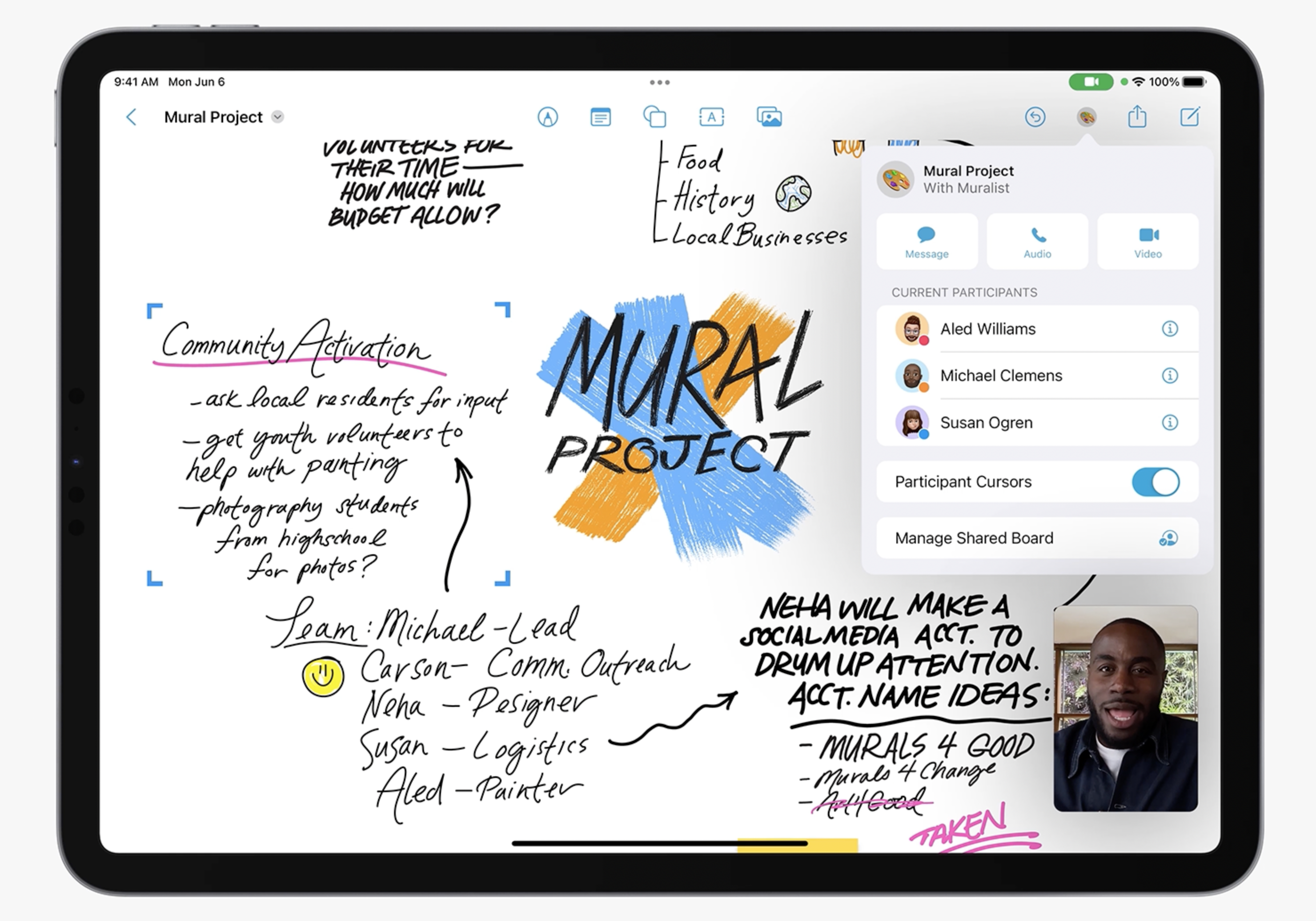 애플펜슬과 아이패드 그리기에서도 혁신적인 변화가 생겼습니다. 함께 캔버스에서 공동 작업을 할 수 있게 Freeform(프리폼) 이라는 앱이 생기는데요. 레이아웃, 페이지 크기에 대한 걱정할 필요 없이 작업이 가능하고 협업하는 사람과 실시간으로 확인하면서 작업을 할 수 있습니다.