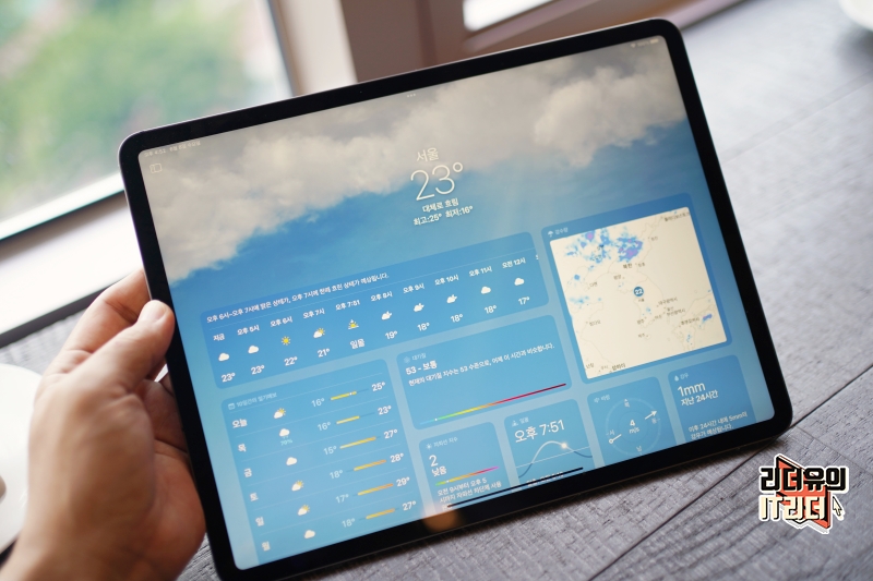 iPadOS 16에서는 아이패드의 대화면을 활용한 날씨 앱이 추가되었습니다. 대화면으로 한눈에 보기 좋게 정보를 제공하고 기상 정보, 강수량, 대기질, 기온을 선택하면 세세한 정보를 볼 수 있습니다. 그리고 대기질의 단계별 색상으로 확인이 가능합니다.