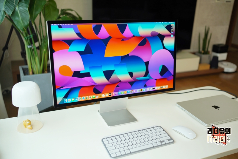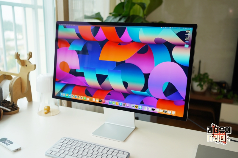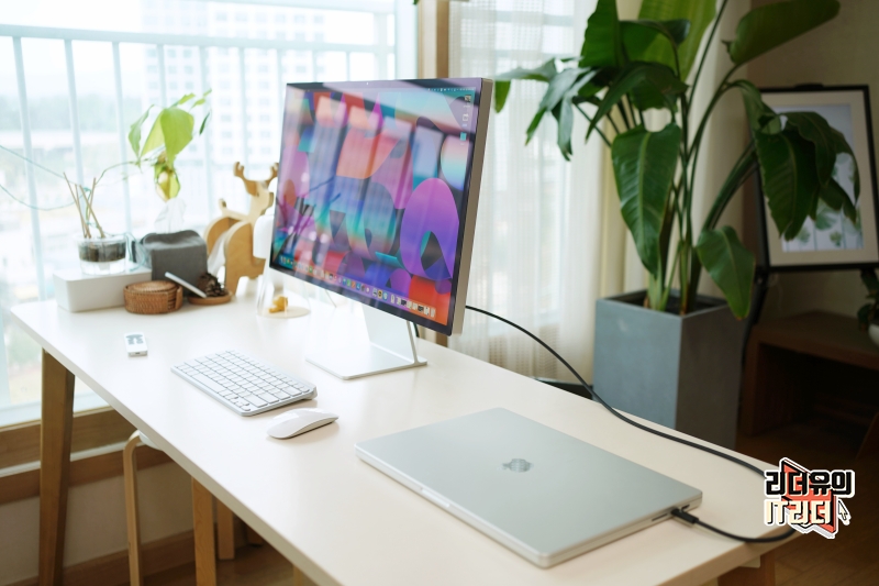 애플 스튜디오 디스플레이에 맥북프로16을 연결한 모습입니다. 일단 연결 후 본 화질은 정말 놀랍습니다. 기대 이상으로 쨍하고 화사한 화면에 감동했습니다. 기존에 사용하던 모니터도 좋다고 생각했는데 비교가 안되는 화질 경쟁력을 보여주고 있습니다.