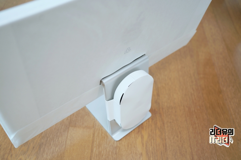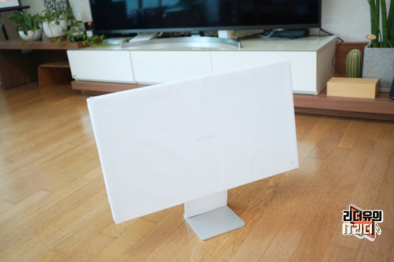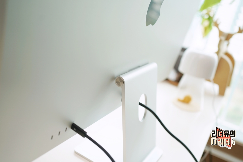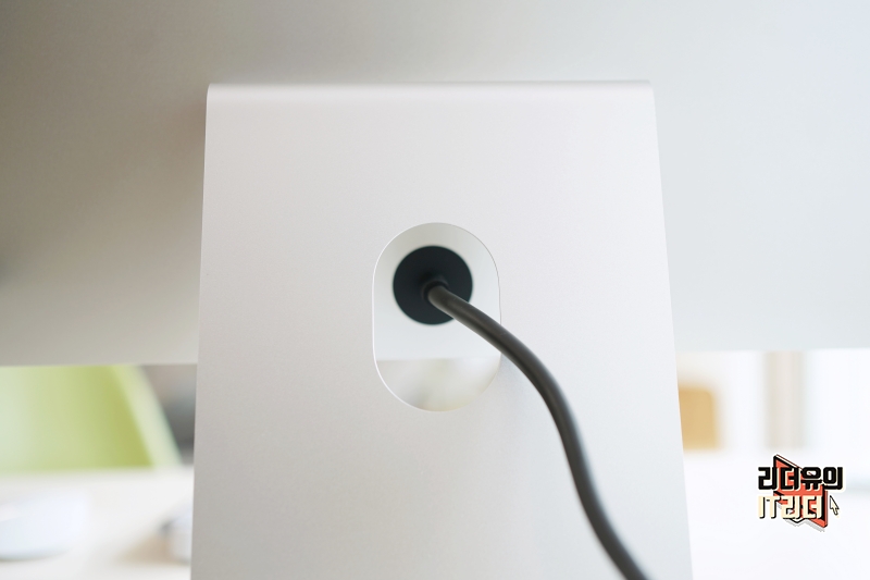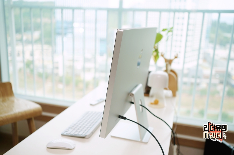 스탠드는 기울기 조절만 가능한 기본 스탠드를 선택했습니다. 디자인은 M1 아이맥 24와 같아서 아이맥 같은 느낌입니다. 그리고 스탠드가 고급스러운 메탈 소재이고 컴팩트하게 디자인 되어 있어 공간 활용도 측면에서도 좋습니다.