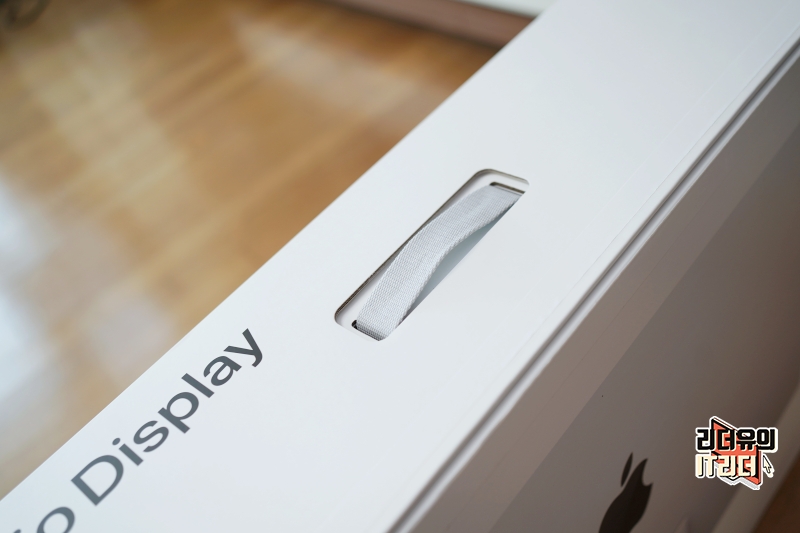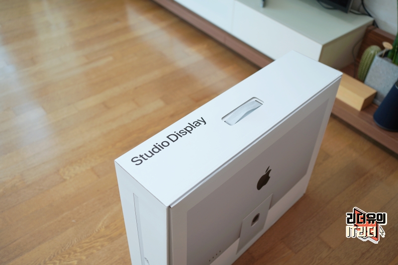 윗면에는 스튜디오 디스플레이라고 쓰여 있고 들 수 있는 손잡이가 있습니다.