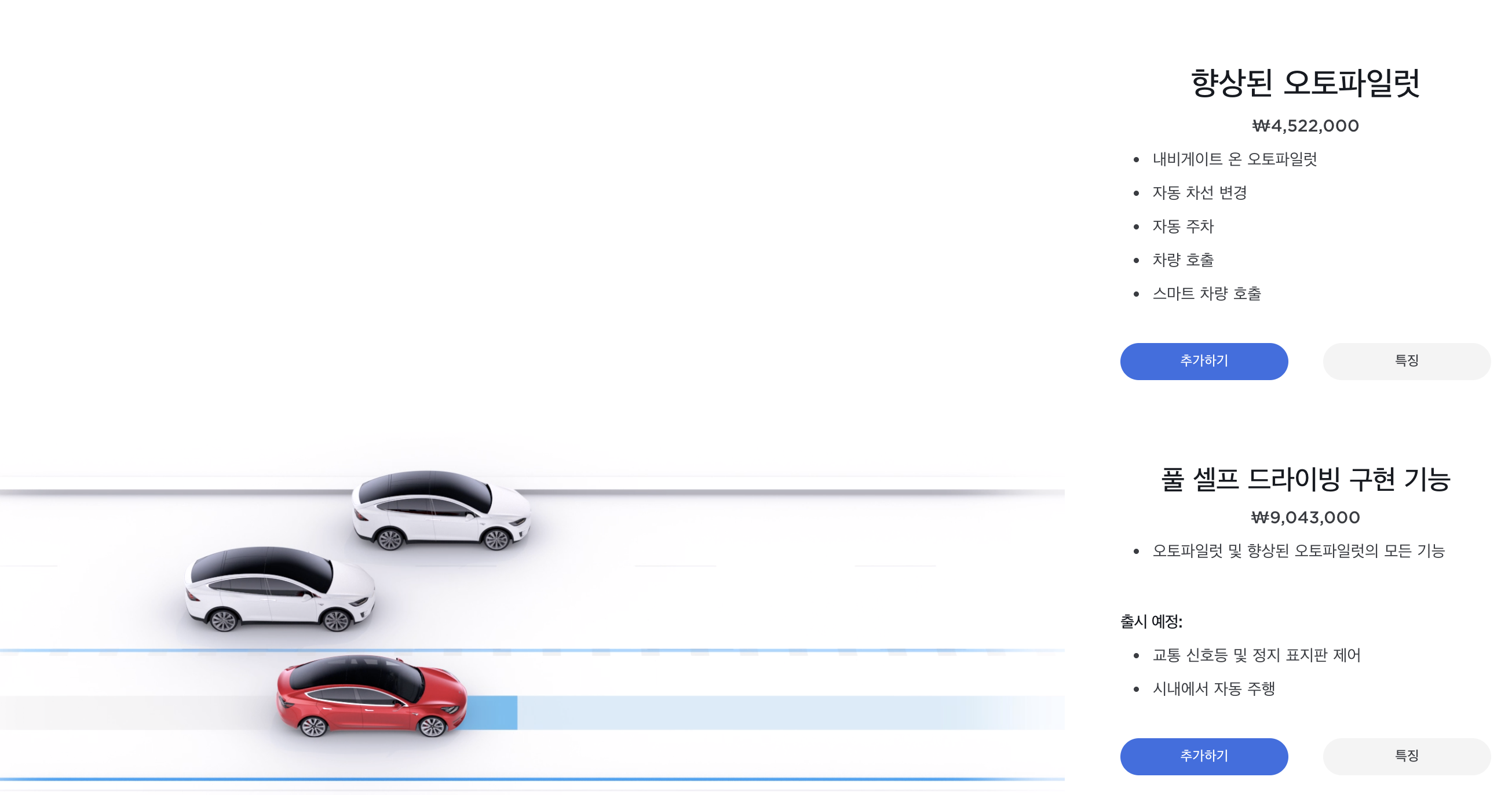 그리고 테슬라는 앞으로 서비스 될 자율주행 FSD에 교통 신호 등 정지 표지판 제어, 시내에서 자동 주행을 만날 수 있다고 알리고 있습니다. 그런데 이 서비스가 국내에서 되려면 꽤 오랜 시간이 필요해 보입니다. 국내 도로 상황상 쉽지 않은 기술이니까요. 더더욱 우리나라는 잦은 끼어들기와 교통 체계가 복잡해 저런 기능이 적용되더라도 많이들 사용하지 않을 수 있습니다. 즉, 당장 필요하지 않은 기술이라 굳이 비싼 가격을 줄 필요는 없어 보입니다.