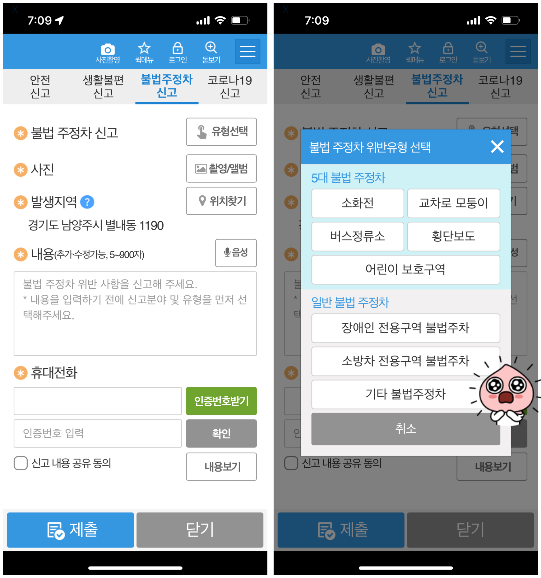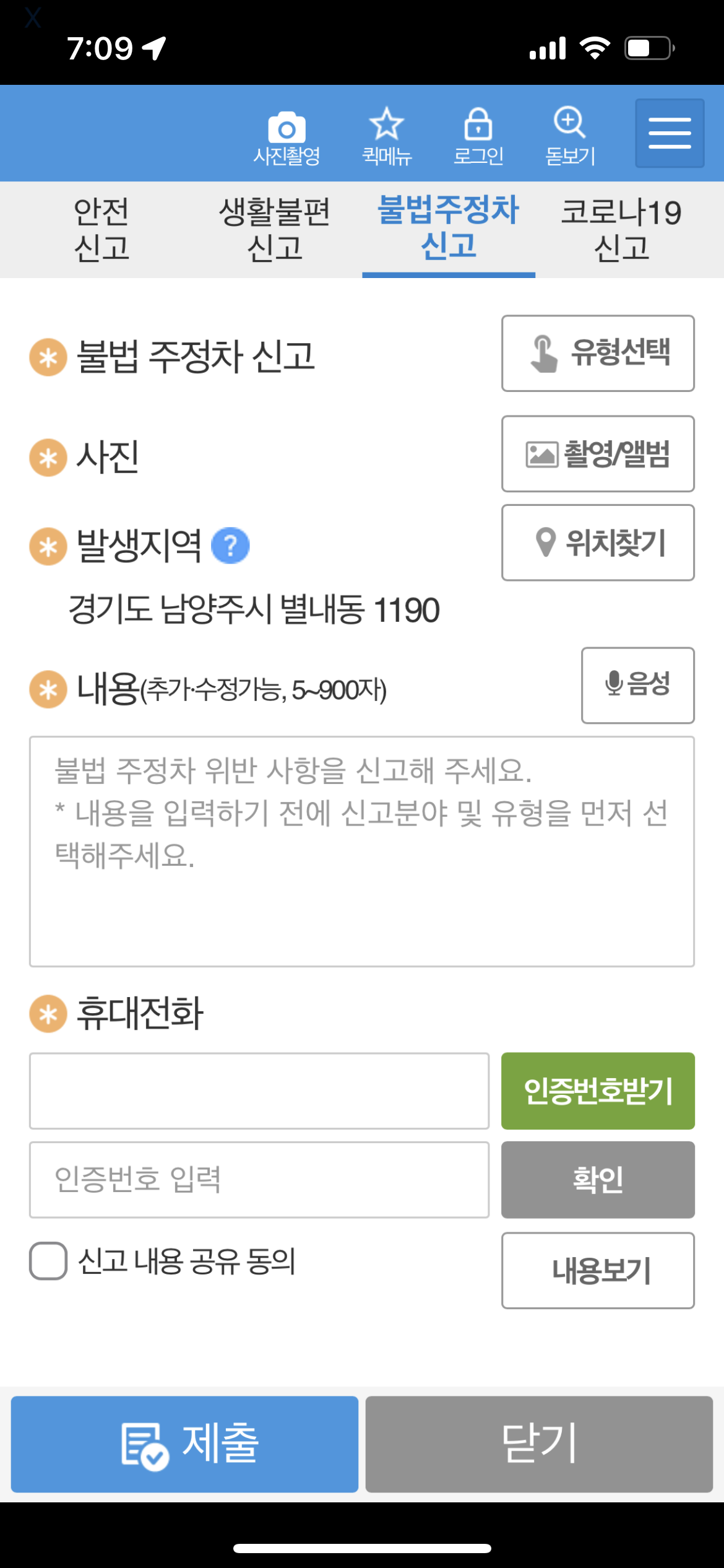 그 다음 내용을 적고 휴대전화 인증을 받고 제출을 하면 끝입니다. 전기차 주차 신고 방법 어렵지 않죠? 처리 결과는 지자체에 따라 다른데요. 약 1주일 정도 기다리면 나옵니다. 그리고 지금은 초반이라 과태료가 부과 될 수도 있고 경고만 나갈 수도 있습니다.
