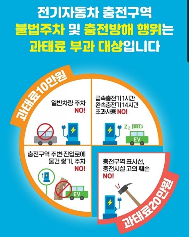전기차 충전구역 불법주차 과태료는 10만원, 20만원이 있습니다.
