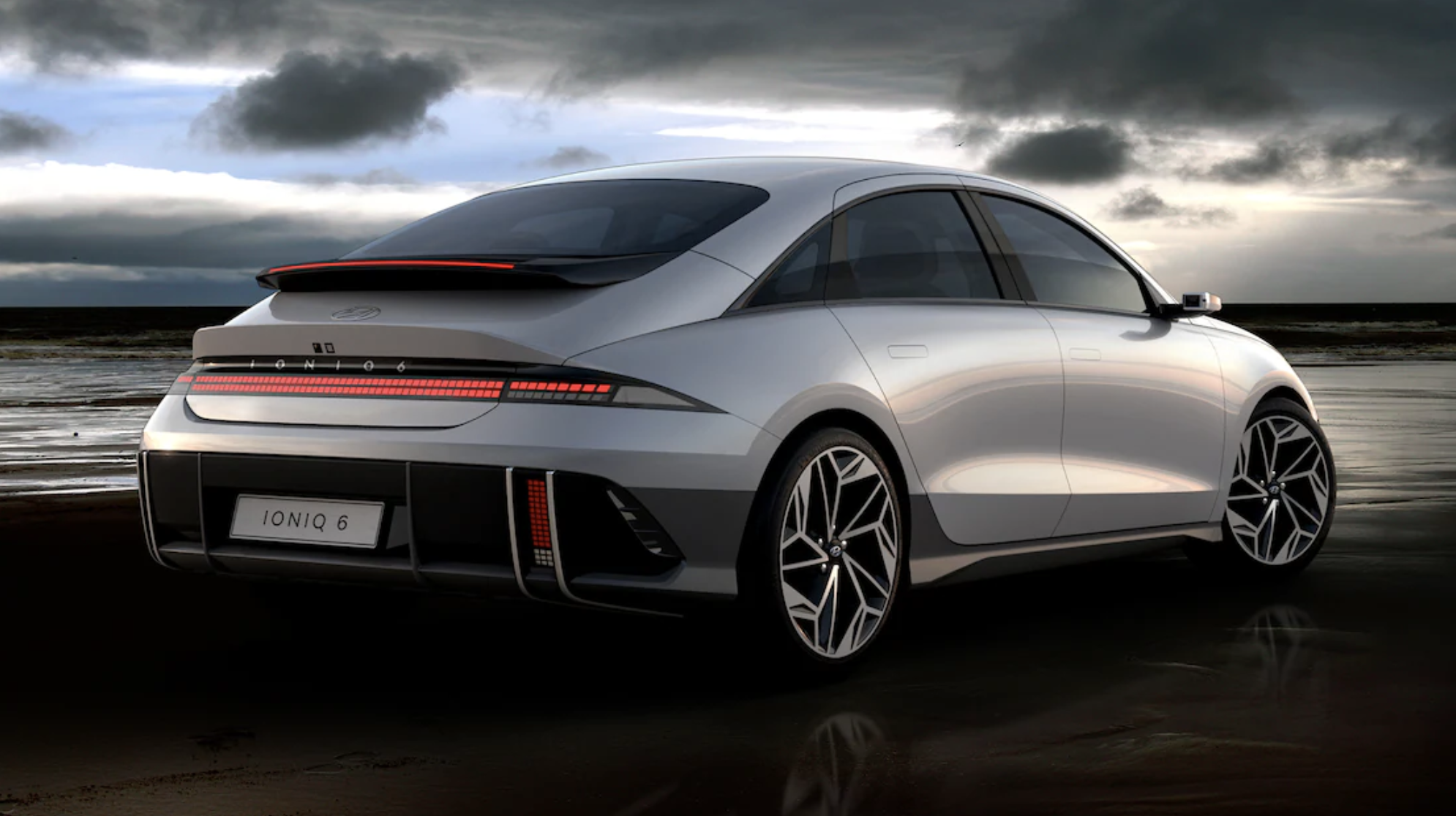 현대 아이오닉6 전기차 후면 모습입니다. 쿠페형 세단 답게 날렵한 라인으로 표현되어 있고 일체형 스포일러로 포인트를 줘 화려한 디자인을 느낄 수 있습니다. 전면 모습보다는 후면 모습이 확실히 예쁘게 느껴집니다.