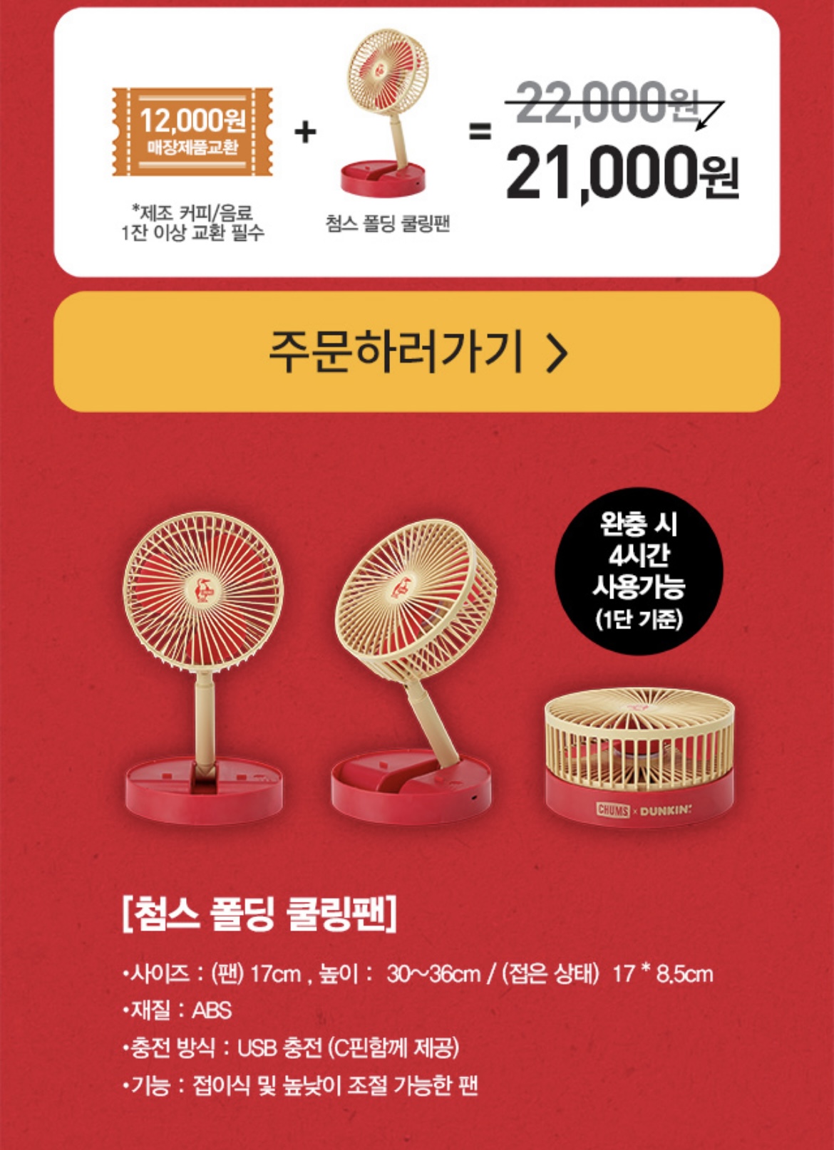 음료를 포함한 던킨도너츠 12,000원 제품 교환권과 첨스 폴딩 쿨링팬 9,000원을 더해 21,000원에 구입을 하는 것입니다. 첨스 폴딩 쿨링팬이 나름 저렴하게 잘 나왔죠. 하지만 던킨도너츠 같은 경우는 할인을 받는 경로가 많이 있기 때문에 사실상 비싸게 금액을 지불해야 하는 함정은 있습니다.
