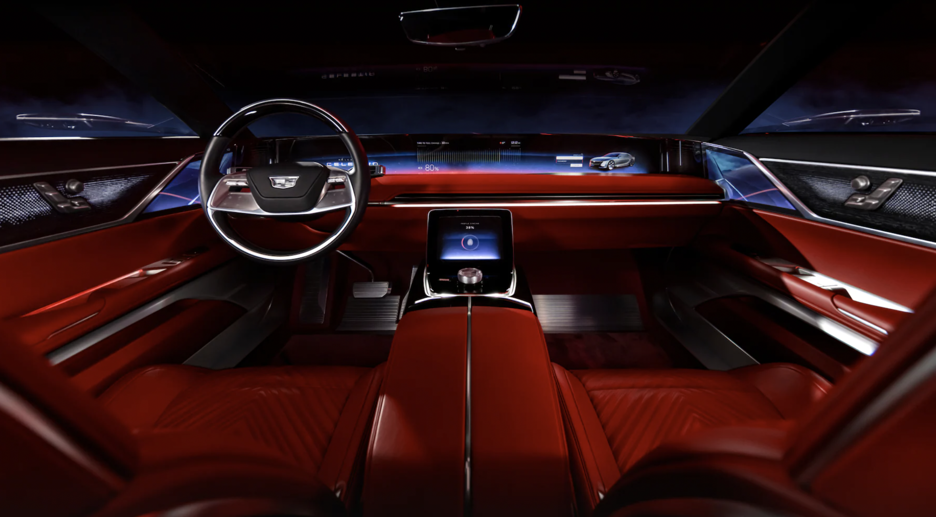 캐딜락 셀리스틱 CELESTIQ 전기차는 실내 디자인도 화려함의 끝을 보여주고 있습니다. 미래 우주선을 보는듯한 화려한 디자인 요소들이 눈길을 사로 잡습니다. 가장 인상적인 부분은 센터페시아 디스플레이 입니다. 동승석 부분까지 와이드하게 풀 화면으로 구성했는데요. 다양한 정보와 시각적인 효과로 차의 전체적인 디자인 컨셉을 잘 보여주고 있습니다. 참고로 화면 사이즈는 무려 55인치나 됩니다.
