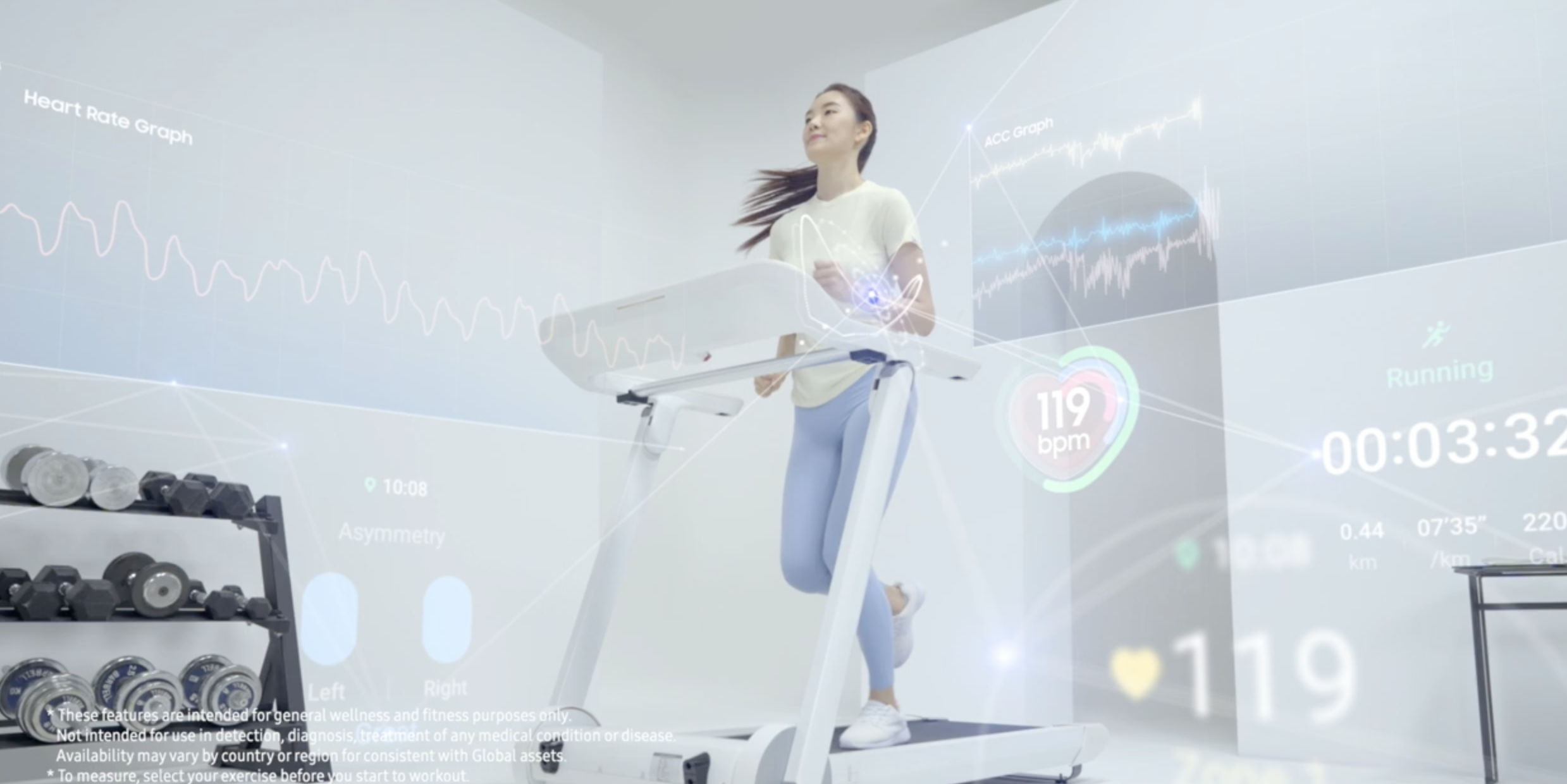 그리고 피트니스시 바이오액티브 센서는 채성분을 측정해 체중 감량 수준을 넘어 신체 건강을 심도 있게 파악할 수 있게 하고 있습니다. 미세전류를 흘려 보내 체중 감량, 골격근량 증가 체지방 감소량, 체수분 수준 등을 설정한 목표와 비교 측정해 목표를 달성할 수 있도록 돕고 있습니다.
