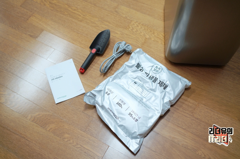 웰씽 미생물 음식물처리기 구성품은 모종삽, 전원선, 웰싱 미생물 제제가 들어 있습니다.