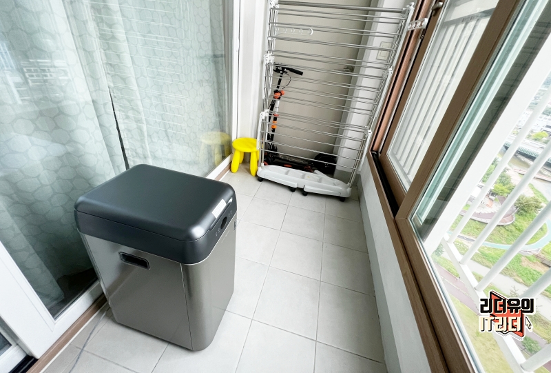 웰싱 미생물 음식물처리기는 디자인부터 예사롭지 않습니다. 전체 바디 소재가 메탈로 되어 있어 디자인에 신경을 많이 썼다는게 느껴집니다. 그만큼 인테리어에 신경 쓴 음식물처리기인데요. 그래서 주방에 설치하려는 분들도 있겠지만 음식물처리기는 송풍이 잘 되는 곳에 설치를 하셔야 합니다. 저같은 경우는 이렇게 베란다에 설치했습니다. 구입 전 어디에 설치하면 좋을지 고려해 보시면 좋을 것 같습니다.