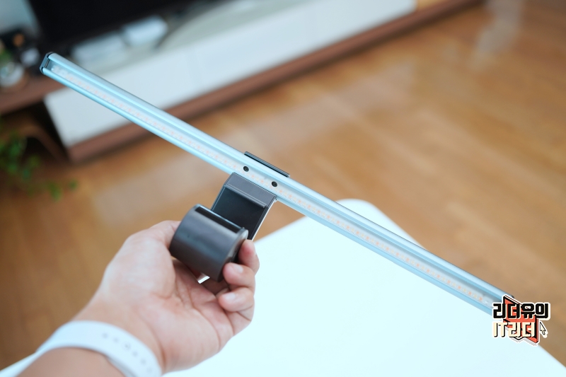 모니터에 장착하는 부분은 클립처럼 스프링이 들어가 있어 안정되게 모니터를 잡아주는 역할을 합니다. 그리고 일부 저렴한 모니터 조명들은 클립 부분의 힘이 너무 강해 모니터에 변형을 주기도 하는데요. 벤큐 스크린바 플러스 아이케어 e리딩 LED 스탠드 모니터 조명은 무게추와 클립을 통해 살짝 벌려서 놓아주기만 하면 흔들리지 않게 잡아줘 모니터에 무리가 가지 않아서 좋습니다.