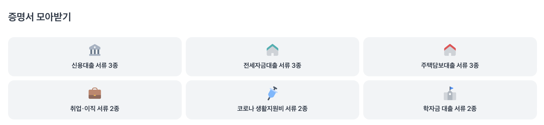 그리고 토스는 상황에 따라 필요한 서류들을 한 번에 발급이 가능한 서비스도 지원을 하고 있습니다. 예를 들어 코로나 생활지원비를 신청해야 할 경우 필요한 서류가 주민등록등본과 건강보험자격득실확인서가 있는데요. 이걸 한 번에 발급 받을 수 있게 도와주고 있습니다.