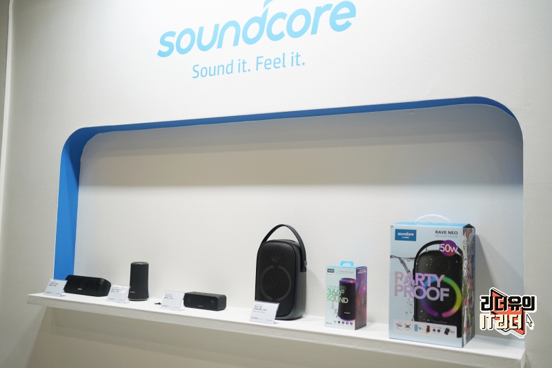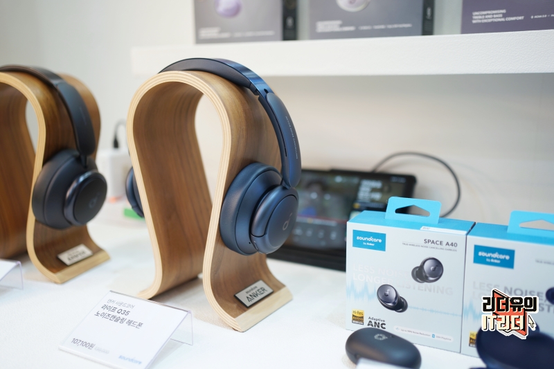 앤커 anker 사운드코어 soundcore 존입니다. 사운드코어는 앤커 산하의 오디오 기기 브랜드로 가성비 좋기로 유명합니다. 이날 처음으로 출시를 앞둔 앤커 사운드코어 스페이스 Q45 노이즈캔슬링 헤드폰이 전시되어 눈길을 사로 잡았습니다.