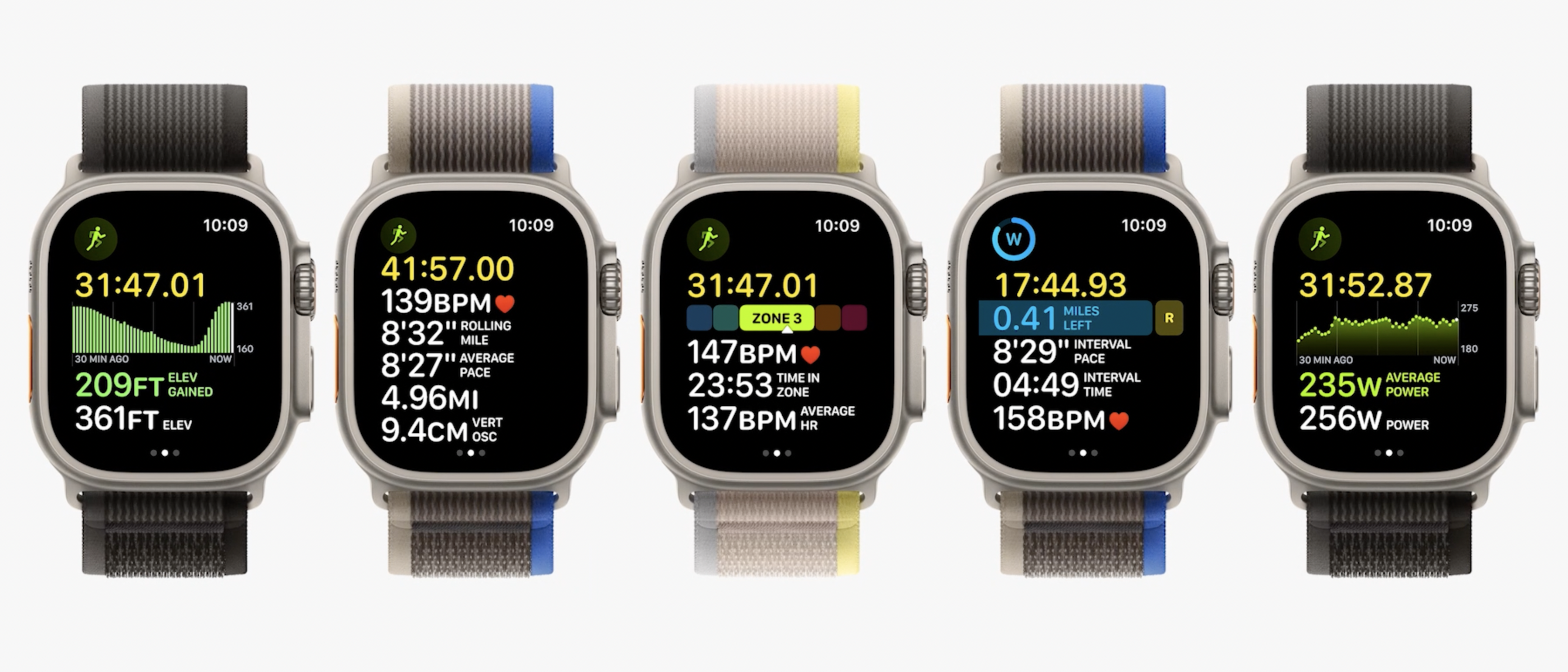 애플워치 울트라에서는 watchOS9을 통해 더욱 정교한 데이터를 보여주게 됩니다. 보폭 길이, 지면 접촉 시간, 수직 진폭, 러닝 파워 등 달리기 관련 측정 수치를 포함해서 볼 수 있고 구간, 스플릿, 고도와 같은 새로운 운동 현형도 한눈에 파악이 가능합니다.