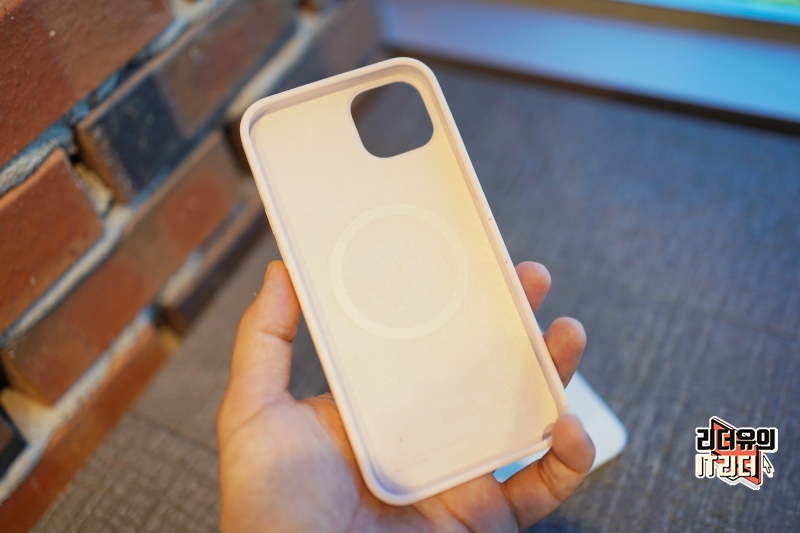 안쪽에는 보들보들한 소재로 되어 있어 아이폰14 플러스를 잘 보호할 수 있게 되어 있고 안쪽에 맥세이프 원형 표시가 보입니다.