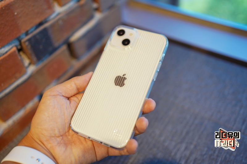 아이폰14 플러스를 장착한 모습입니다. 후면의 컬러 느낌을 살리면서 스트라이프가 적용되어 개성있는 디자인을 느낄 수 있습니다. 아이폰의 산뜻한 컬러와 매칭이 잘 됩니다.