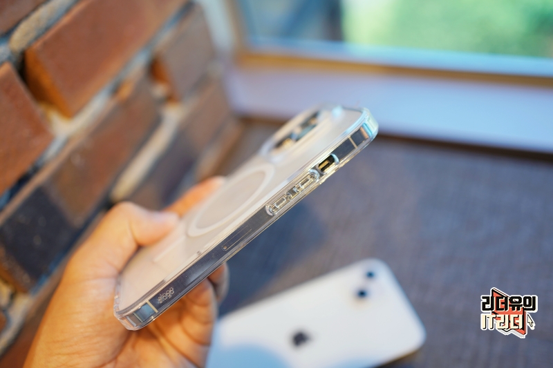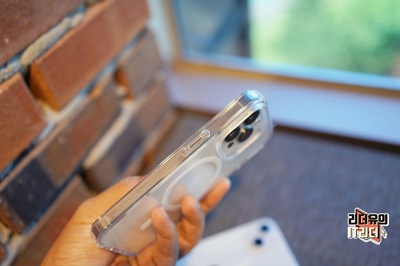 그리고 맥세이프 케이스라는 걸 보여주는 원형의 라인이 보입니다. 여기에는 1mm 네오디듐 자석을 사용해 타사대비 강력한 자력을 가지고 있습니다. 그리고 오래써도 변색되지 않는 UV변색 방지소재를 사용해 오랫동안 깨끗함을 유지할 수 있습니다.