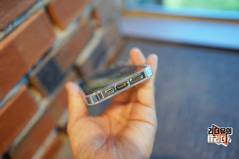 전면에서 보는 느낌은 깔끔하고 좋습니다. 투명 케이스라 원래 아이폰14 프로의 색상을 잘 보여주면서 사용할 수 있습니다.