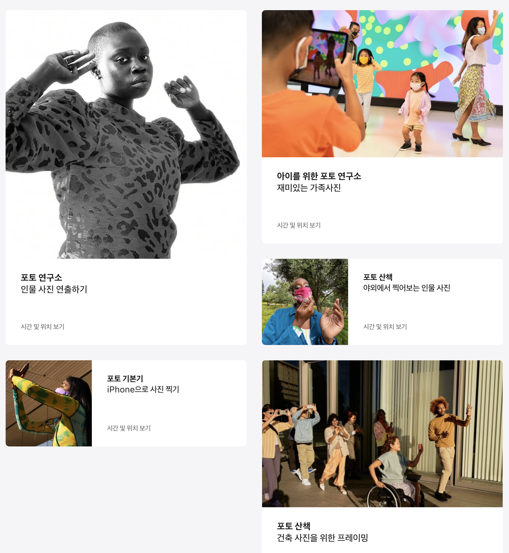 애플스토어의 좋은점은 단순히 제품을 확인하는 것에서 그치지 않습니다. 애플은 다양한 교육 프로그램을 통해 애플 제품을 제대로 활용할 수 있게 해주는데요. 잠실 애플스토어에서도 다양한 무료 교육 프로그램이 진행 될 예정이니 참고해 두시면 좋을 것 같습니다. 애플 Today at Apple 은 사전 예약을 통해 들을 수 있습니다.