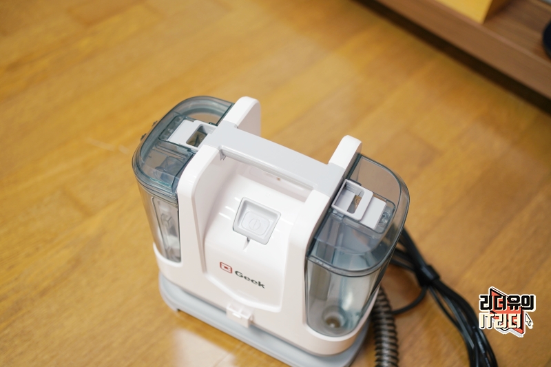 눕스 Geek 카펫 패브릭 청소기 옆 모습입니다. 오른쪽은 청수통이고 왼쪽은 오수통입니다. 그리고 가운데 손잡이가 있고 그 아래 전원 버튼이 있는 구조입니다. 그리고 아래쪽 거치대를 보면 오목하게 들어가 있는데요. 호스를 말 수 있게 설계된 영역입니다.