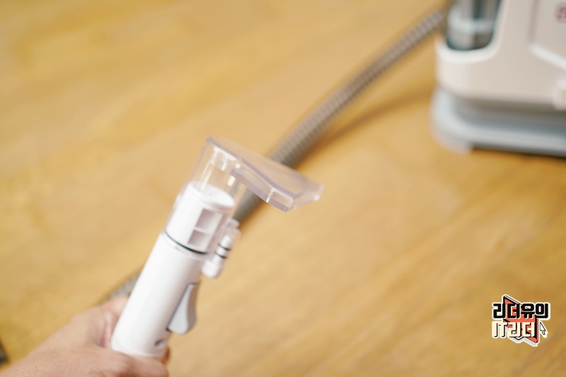 패브릭 청소기로 사용할 때는 투명한 브러쉬를 사용합니다. 앞쪽이 슬림하게 되어 있는데요. 강력한 흡입력으로 세척을 하게 됩니다.