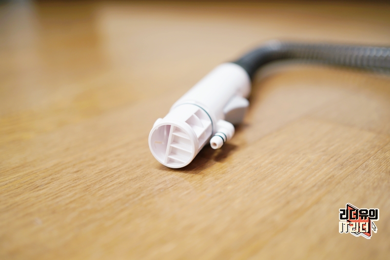 호스 앞부분에는 브러쉬를 연결할 수 있는 영역이 있습니다. 아래쪽에 보면 작은 노즐이 보이는데요. 물배출구 입니다.