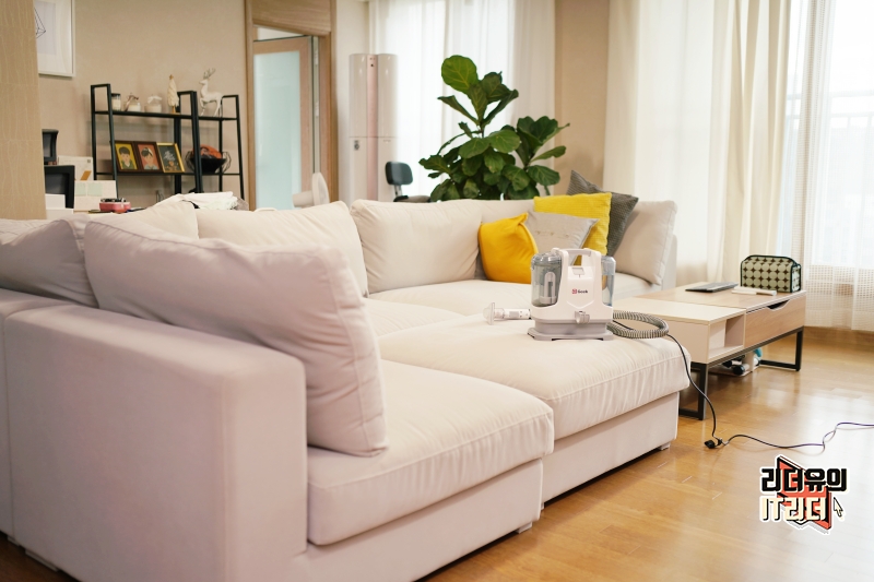 얼룩이 있는 패브릭 소파 였는데요. 물과 함께 청소가 되고 있습니다. 물이 나오고 그걸 빨아들이면서 청소가 되는 것입니다.