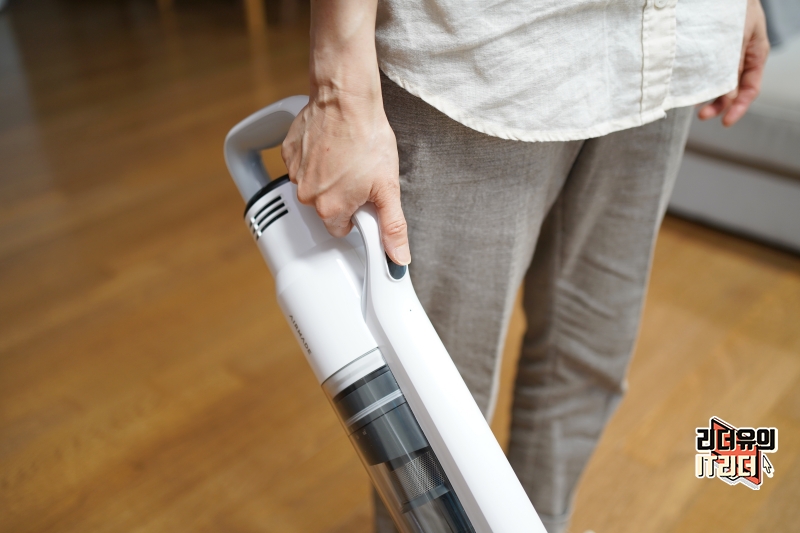 그립했을때 손에 자연스럽게 위치한 곳이라 컨트롤 하기 좋습니다. 그리고 전체적으로 인체공학적인 설계로 손목이 꺽이지 않게 무제중심이 아래로 되어 있어 편안하고 안정된 청소를 할 수 있습니다.