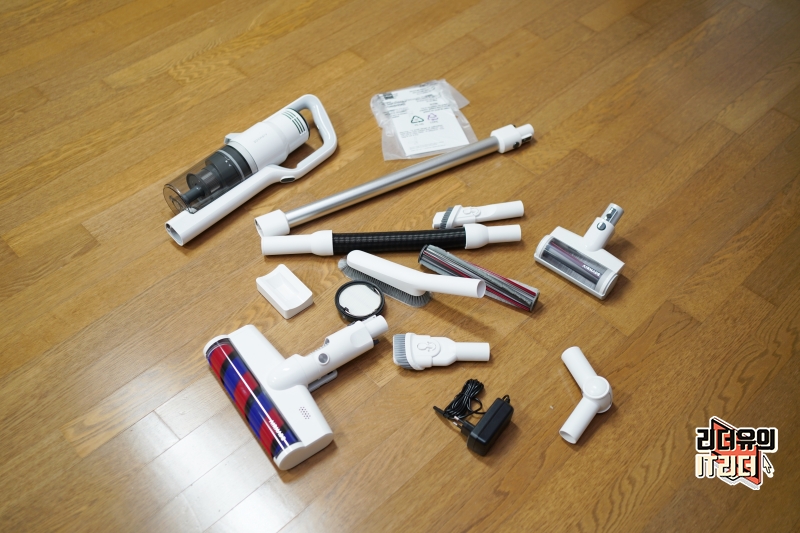 에어메이드 무선청소기 THE 500+ 구성품은 정말 풍성하게 제공됩니다. 20만원대 무선청소기라고 볼 수 없을 정도로 본체, 추가 헤파필터, 충전기, 2in1 솔브러시, 2in1 틈새브러시, 조인트파이프, 소프트브러시, 간편거치대, 플렉시블호스, 침구용헤드, 카펫롤브러시로 구성되어 있습니다.