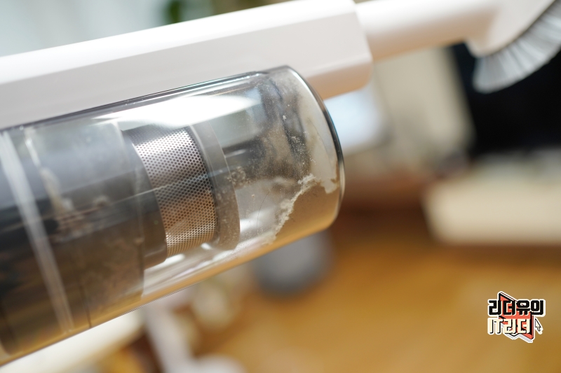 아래에는 먼지통이 붙어 있습니다. 먼지를 쉽게 확인할 수 있게 투명하게 처리되어 있고 5단계 필터시스템으로 흡입된 먼지와 공기를 분리시켜 2차 오염이 발생되지 않게 잘 설계되어 있습니다.