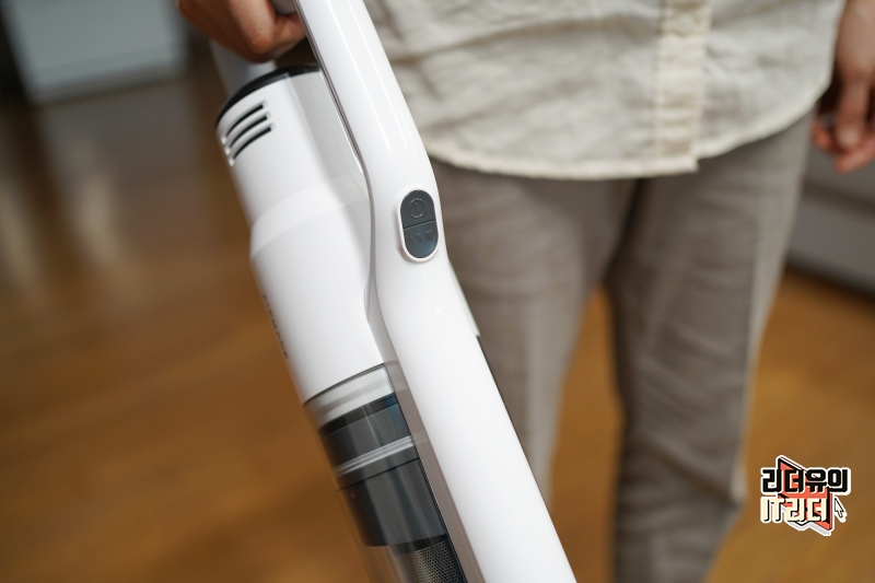 그립했을때 손에 자연스럽게 위치한 곳이라 컨트롤 하기 좋습니다. 그리고 전체적으로 인체공학적인 설계로 손목이 꺽이지 않게 무제중심이 아래로 되어 있어 편안하고 안정된 청소를 할 수 있습니다.