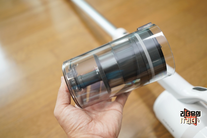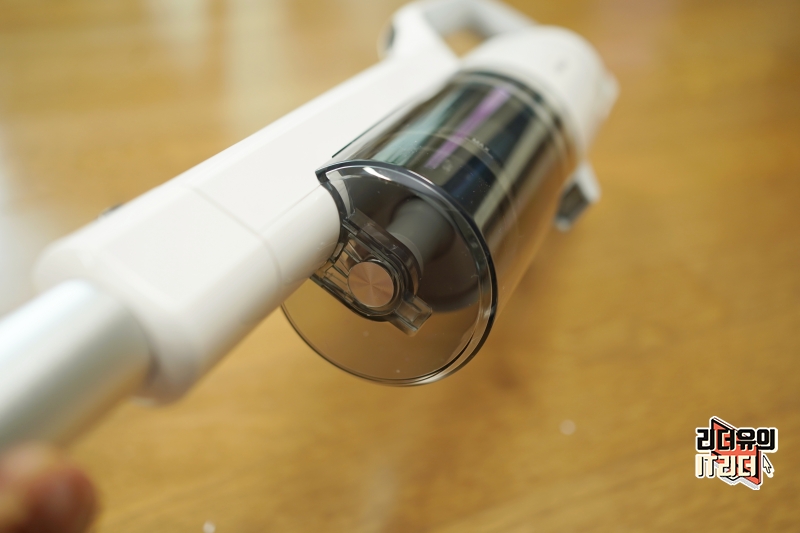 아래에는 먼지통이 붙어 있습니다. 먼지를 쉽게 확인할 수 있게 투명하게 처리되어 있고 5단계 필터시스템으로 흡입된 먼지와 공기를 분리시켜 2차 오염이 발생되지 않게 잘 설계되어 있습니다.