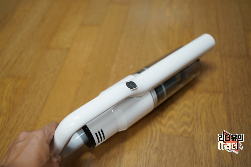 손잡이 영역은 테두리를 두르듯 넓게 포진되어 있어 어디든 쉽게 잡을 수 있고 앞쪽에는 작동 버튼, 청소 세기 버튼이 위치해 있습니다.
