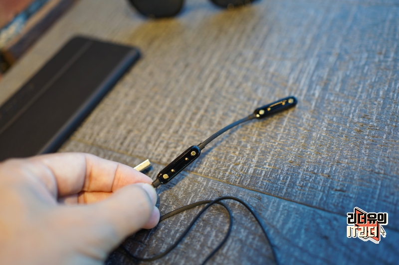 아래쪽을 보면 충전 단자가 있습니다. 사이즈를 작게 하기 위해 일반적인 USB 충전 방식이 아니라 자석 방식으로 부착하는 충전 단자 입니다.