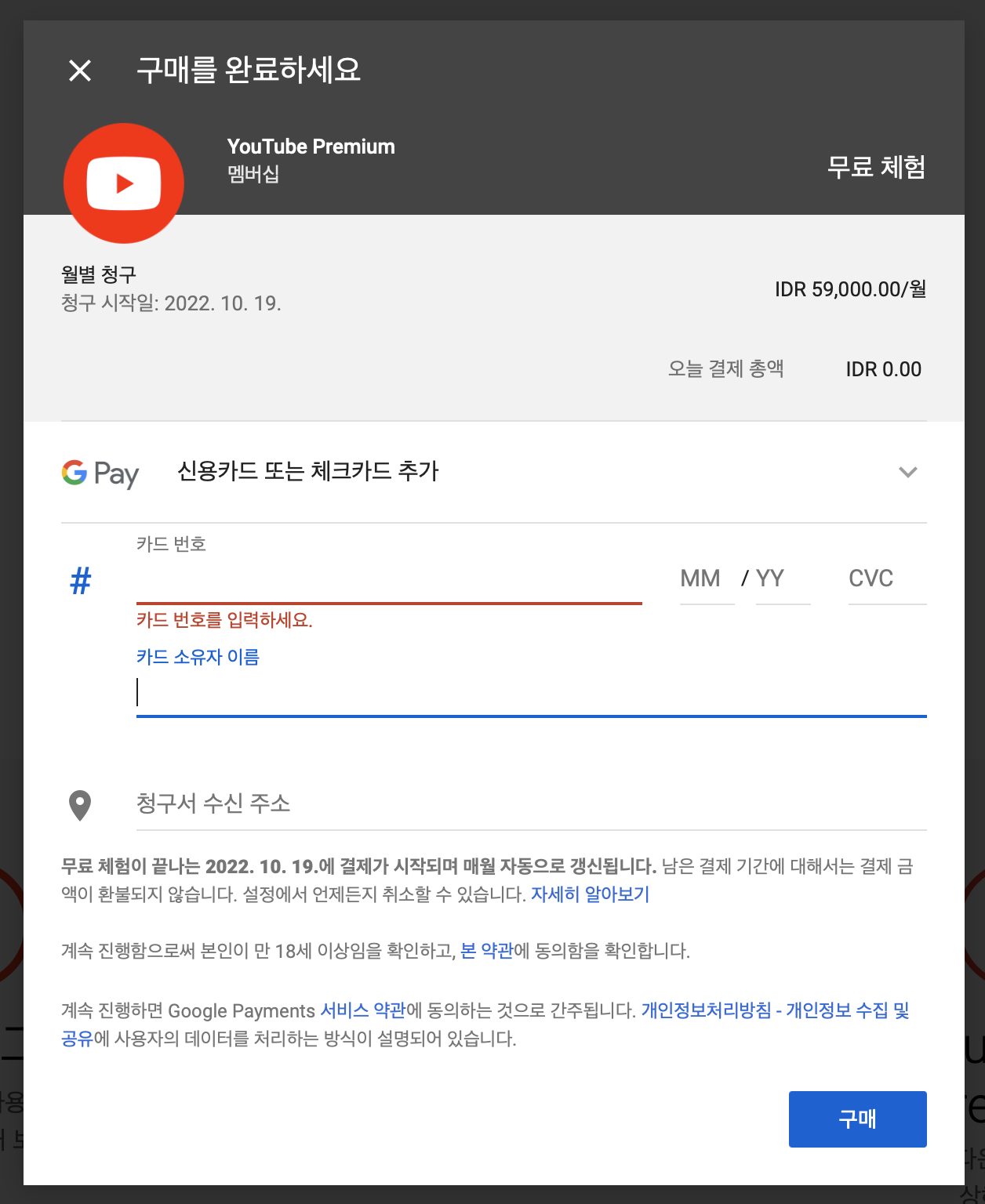 아무튼 이렇게만 하면 유튜브 프리미엄 서비스 가입이 완료됩니다.