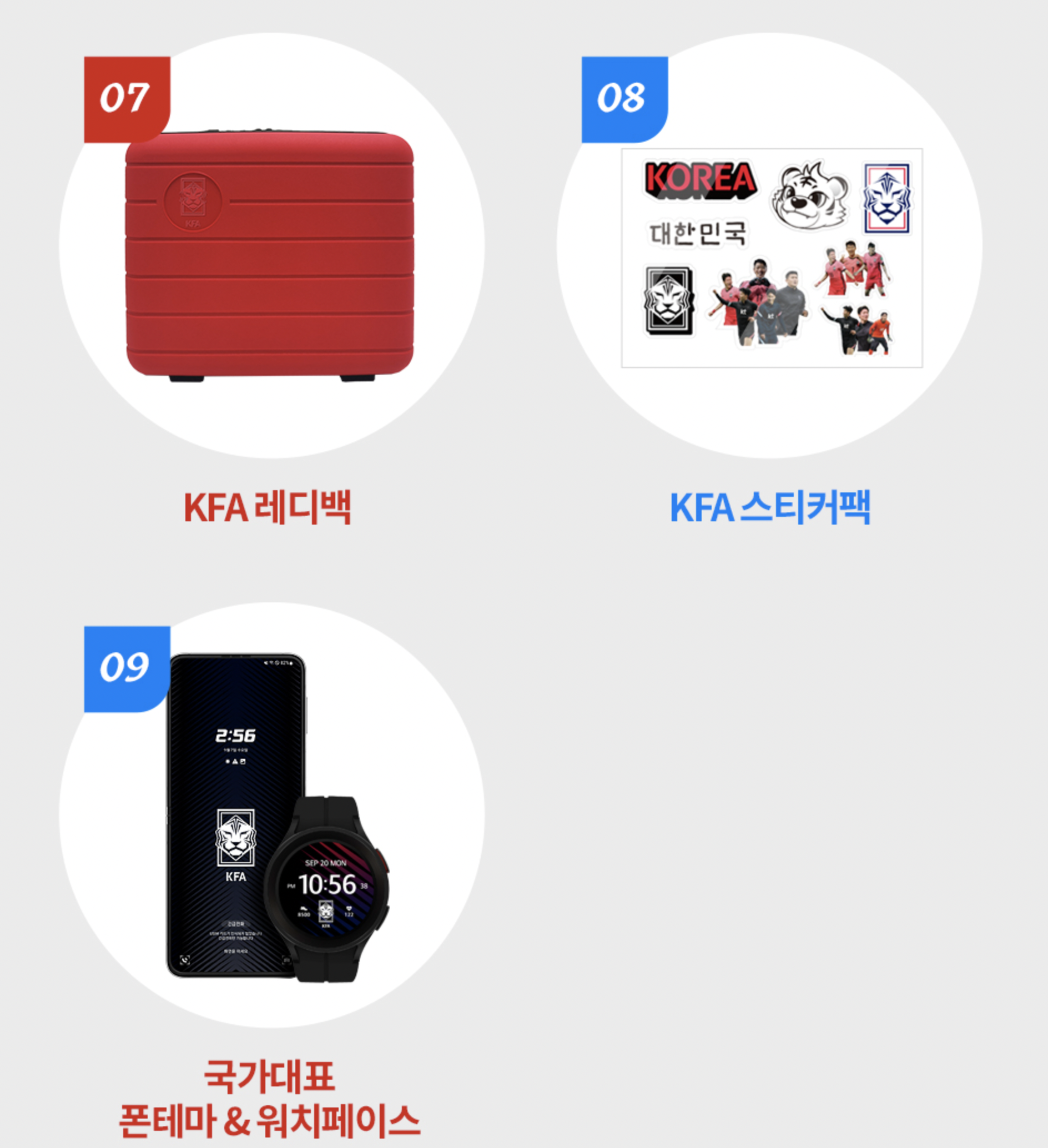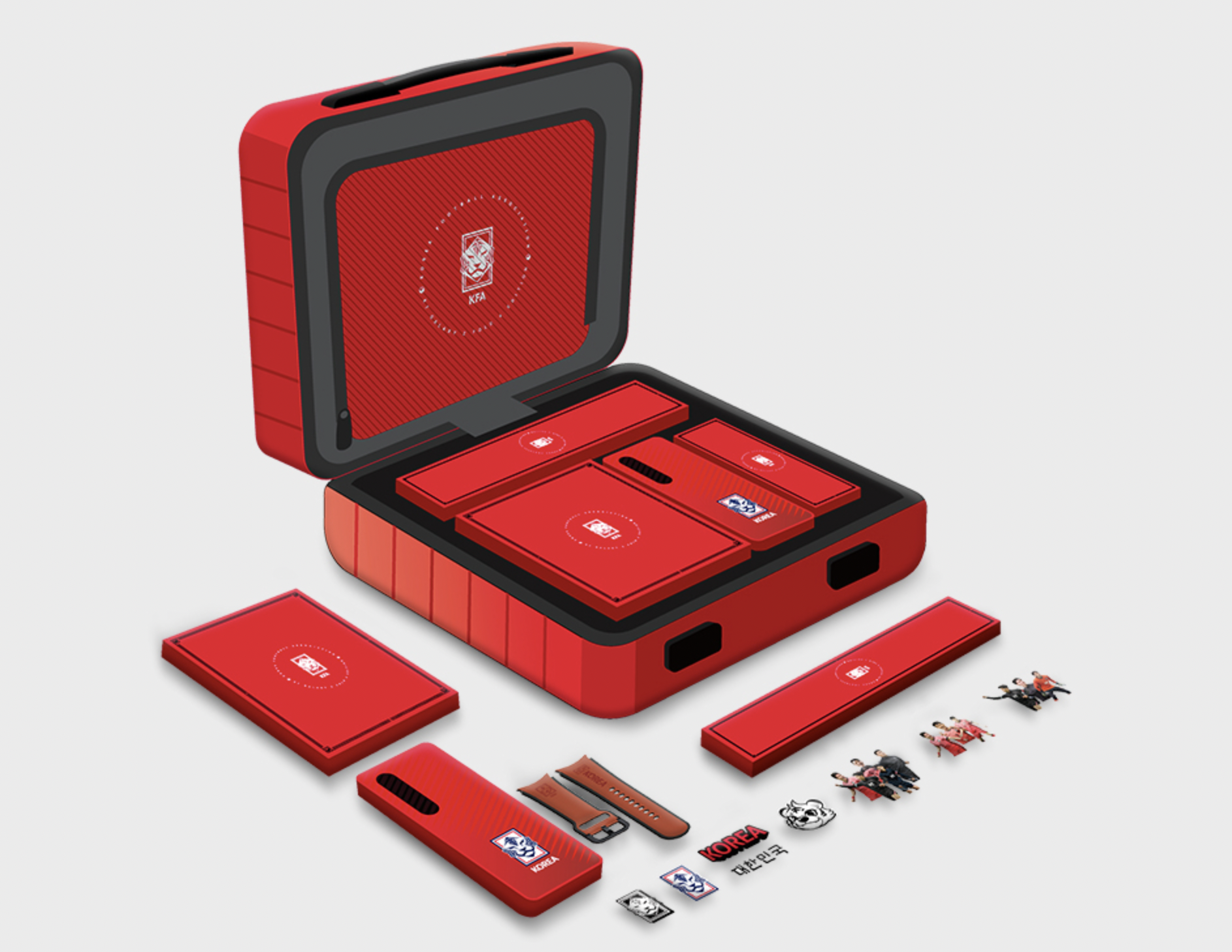 그리고 전체 제품을 담는 케이스는 KFA 레디백으로 되어 있습니다. 여행용 가방으로 쓸 수 있게 준비된 것이지만 사이즈는 작아 보입니다. 여기에 꾸밀 수 있는 KFA 스티커팩과 국가대표 폰 테카& 워치페이스가 제공됩니다.