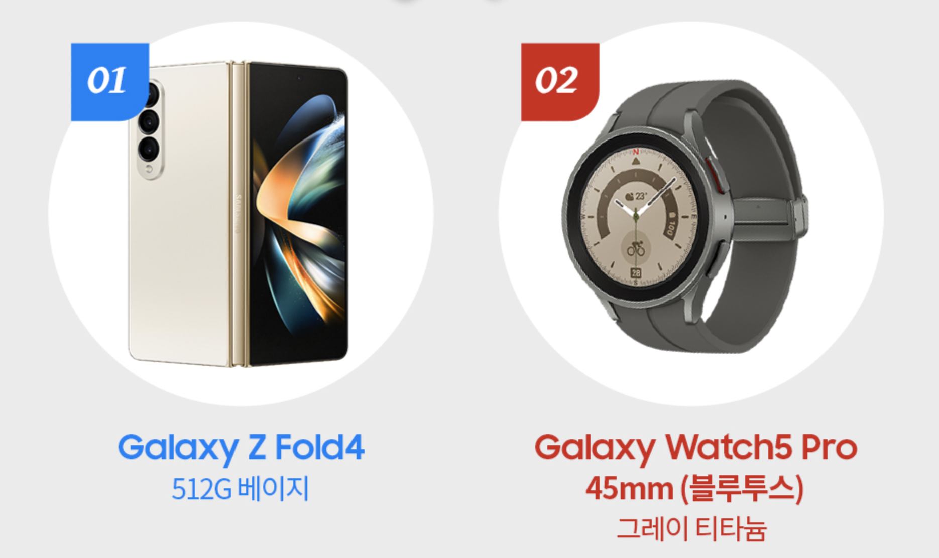 스마트폰은 갤럭시Z 폴드4 512GB 베이지 색상이 들어 있습니다. 가장 인기 있는 색상이니 나쁘지 않은 구성입니다. 그리고 갤럭시 워치5 프로 45mm 그레이 티타늄 색상이 포함되어 있습니다. 이것도 가장 인기 있는 색상이니 괜찮죠?