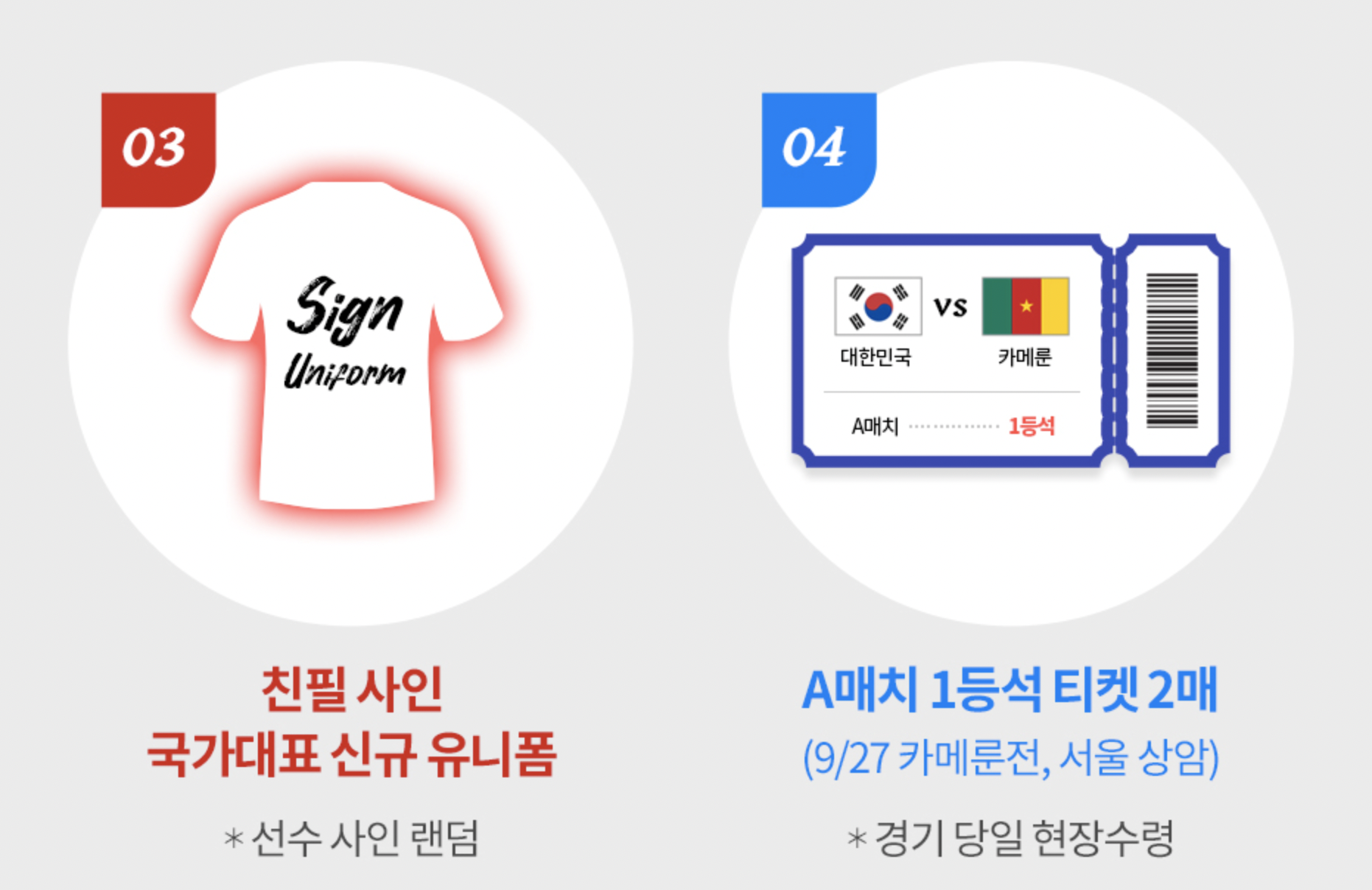 그리고 스페셜한 구성으로 친필 사인 국가대표 신규 유니폼이 제공됩니다. 선수 사인 랜덤이라고 하니 손흥민 사인이 들어간 분은 대박날 것 같습니다. 그리고 A매치 1등석 티켓 2매가 포함되어 있습니다. 9월 27일 카메룬전 티켓 입니다.