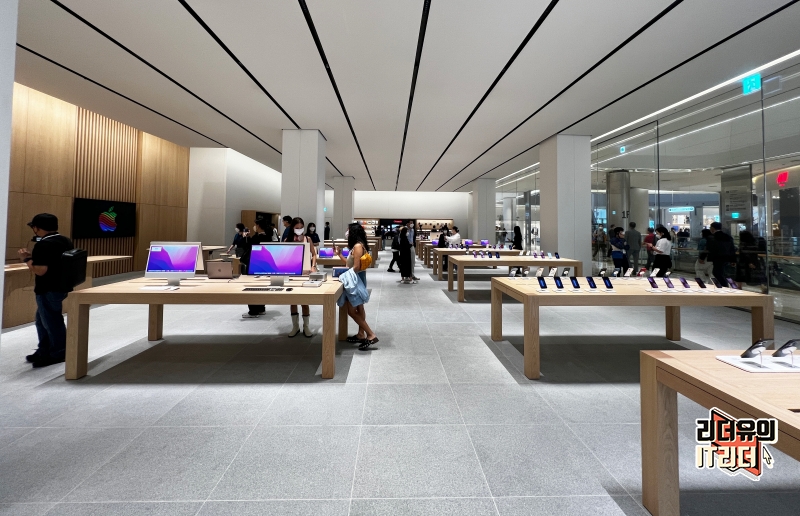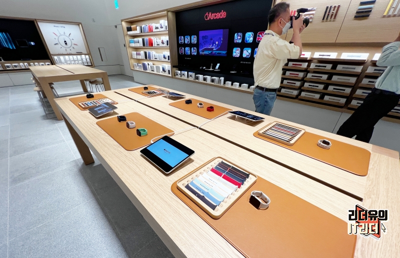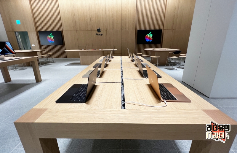 애플 잠실 내부는 2열 배치로 되어 있습니다. 애플스토어 인테리어 포인트인 원목 테이블에는 아이폰, 아이패드, 애플워치, 맥 등을 영역별로 구분해서 배치해 두었습니다.