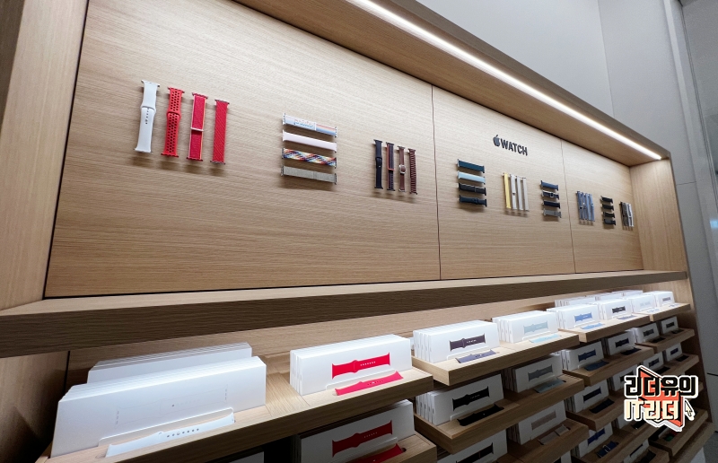애플워치 존에는 다양한 밴드들을 실착해 볼 수 있게 준비되어 있습니다. 애플워치는 밴드를 변경하는게 또 다른 재미 포인트죠. 다양한 스타일의 밴드들을 직접 착용해 보고 고를 수 있어 좋은 공간입니다.