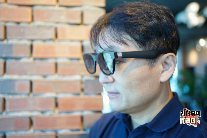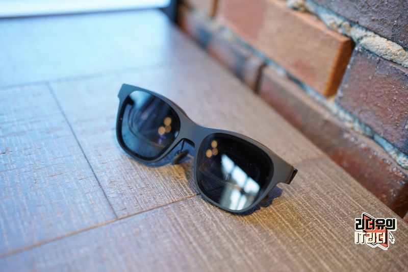 Nreal Air (엔리얼 에어) AR글래스를 착용한 모습입니다. 옆에서 보면 안경 영역이 앞으로 튀어나오긴 하지만 앞에서 보거나 얼핏 보면 그냥 선글라스를 착용한 느낌입니다. 그래서 카페 같은 공간에서도 나혼자 만의 시간을 보내기에도 괜찮습니다.