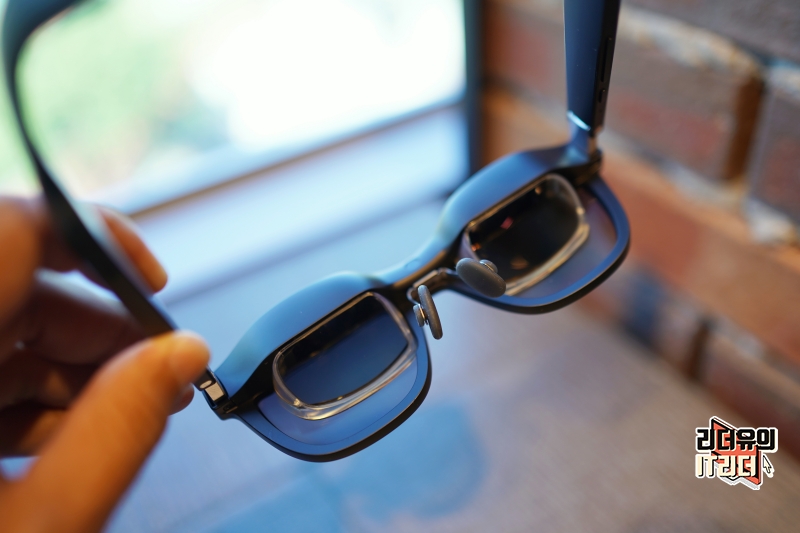 Nreal Air (엔리얼 에어) AR글래스 핵심인 안쪽에는 고품질의 디스플레이를 가지고 있습니다. 디스플레이 위치는 위쪽에 달려 있고 반사경을 통해 눈으로 볼 수 있게 해 현실 세계와 가상의 세계를 잘 녹아들게 표현했습니다.