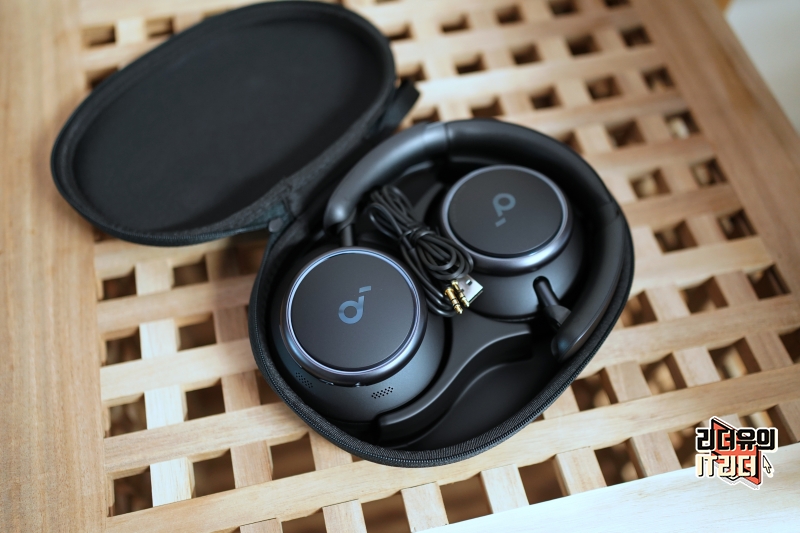 앤커 사운드코어 스페이스 Q45 파우치를 오픈하면 구성품과 함께 포장되어 있습니다. 충전할 수 있는 USB-C 타입 케이블과 유선으로 사용할 수 있는 3.5mm 케이블이 제공됩니다.