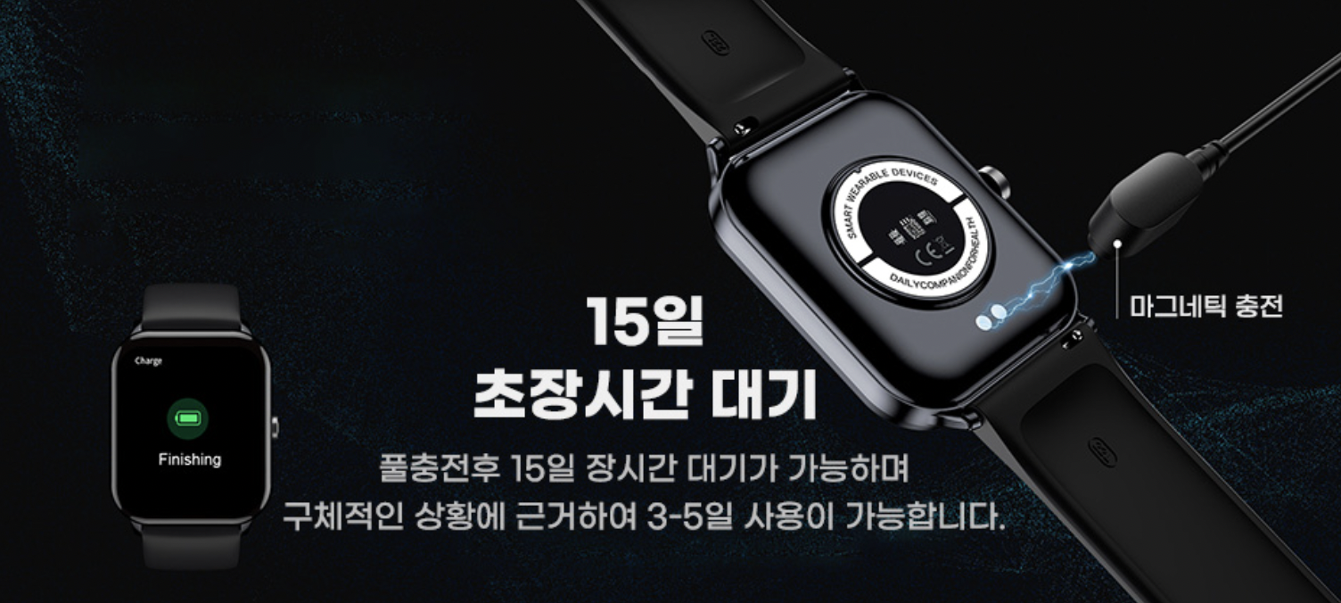 QCY 스마트워치 GTC는 최대 3~5일 사용이 가능합니다. 대기 시간을 기준으로 15일을 강조하고 있는데 대기 시간은 큰 의미가 없는 부분이죠.