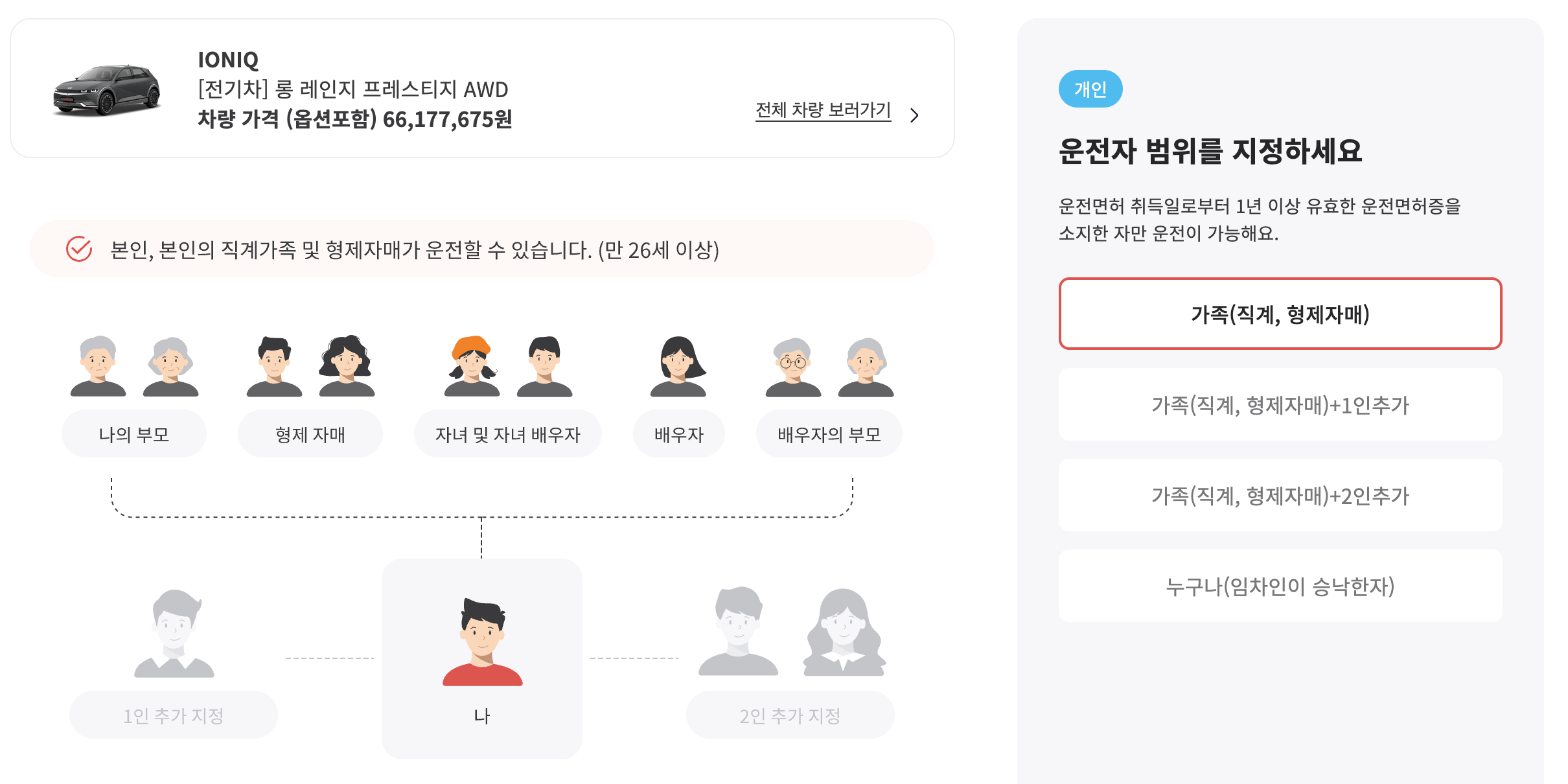 그리고 운전자 범위를 선택하게 나옵니다. 가족을 선택하면 나의 부모, 형제 자매, 자녀 및 배우자까지 범위에 들어갑니다.