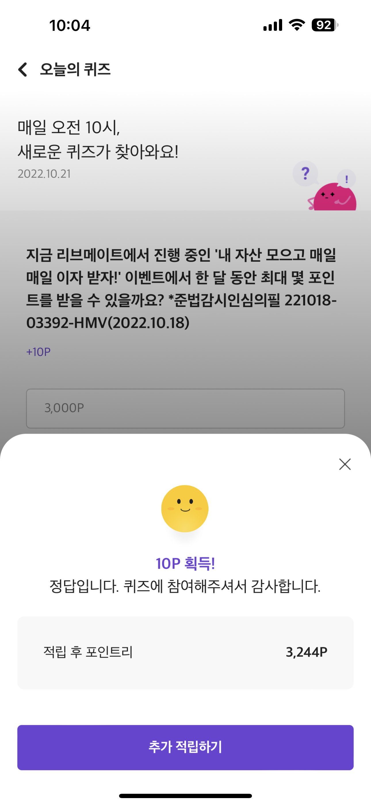 문제는 다음과 같습니디ㅏ. 지금 리브메이트에서 진행 중인 '내 자산 모으고 매일 매일 이자 받자!' 이벤트에서 한 달 동안 최대 몇 포인트를 받을 수 있을까요? 준법감시인심의필 221018-03392HMV (2022.10.18) 보기는 3,000P, 5,000P, 10,000P 입니다. 10포인트를 받을 수 있는 이 정답은